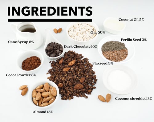 ข้าวโอ๊ต(Oat), อัลมอนด์(Almond), ดาร์กช็อกโกแลต(Dark Chocolate), น้ำอ้อยธรรมชาติ(Cane Syrup), น้ำมันมะพร้าว(Coconut Oill), งาขี้ม่อน (Perilla Seed), แฟลกซีด(Flaxseed), ดาร์กโกโก้(Cocoa Powder), เกล็ดมะพร้าว(Shredded Coconut)