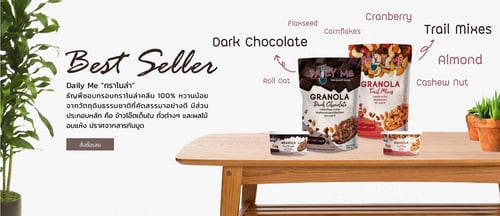 เราเป็นผู้ผลิตและจัดจำหน่ายธัญพืชต่างๆ ภายใต้แบรนด์เดลลี่ มี ( Daily Me ) ผลิตและจัดจำหน่ายซีเรียลธัญพืชอบกรอบกราโนล่ารสชาติต่างๆ